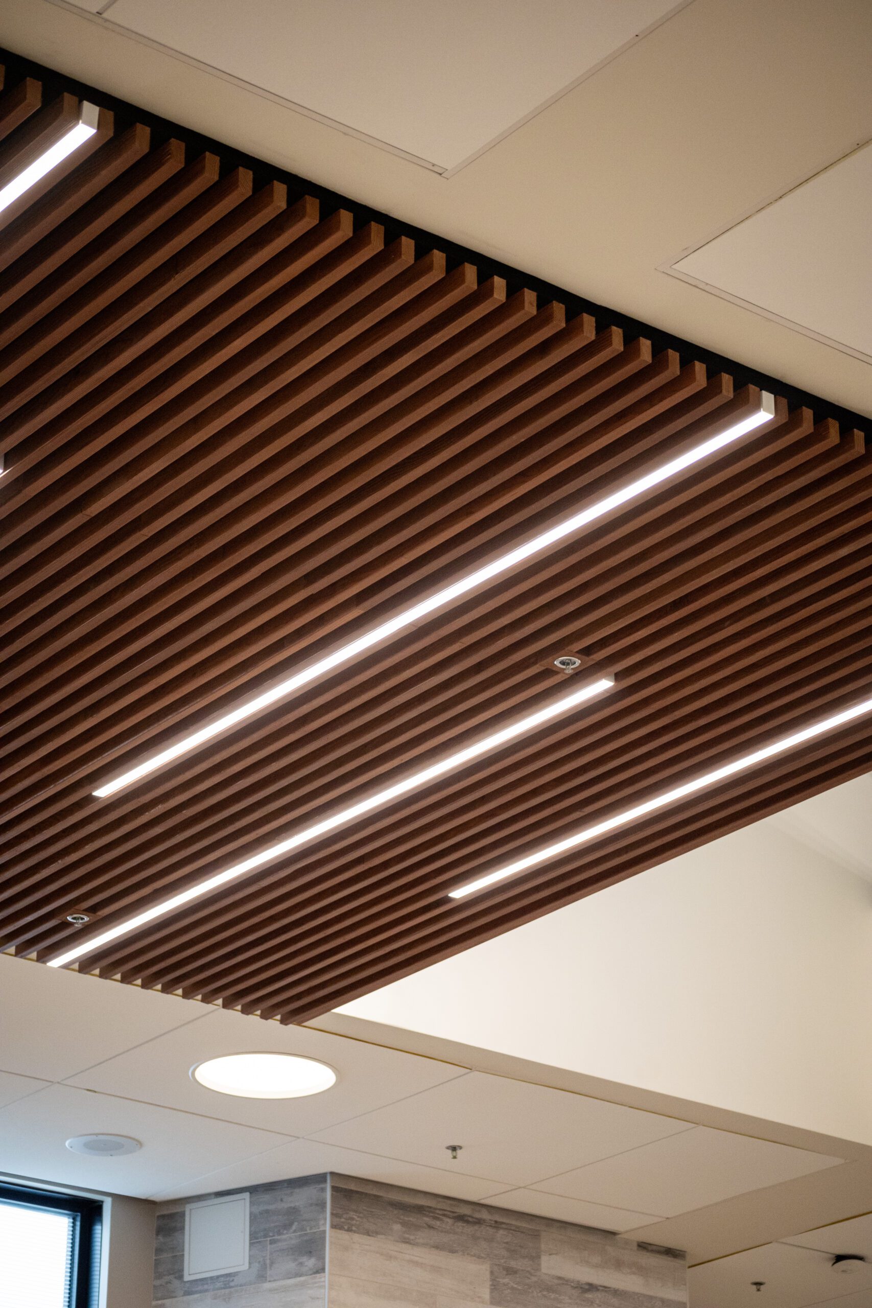 The design requirements were equally demanding — long, continuous ceiling lines with virtually zero tolerance for warping or twisting. Because the fir slats needed Class A fire-rated coatings, moisture control and stability became a major concern.
